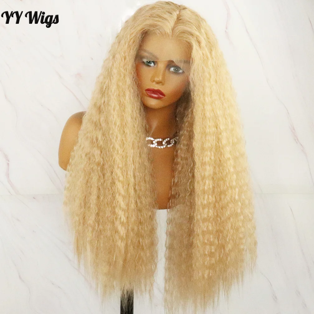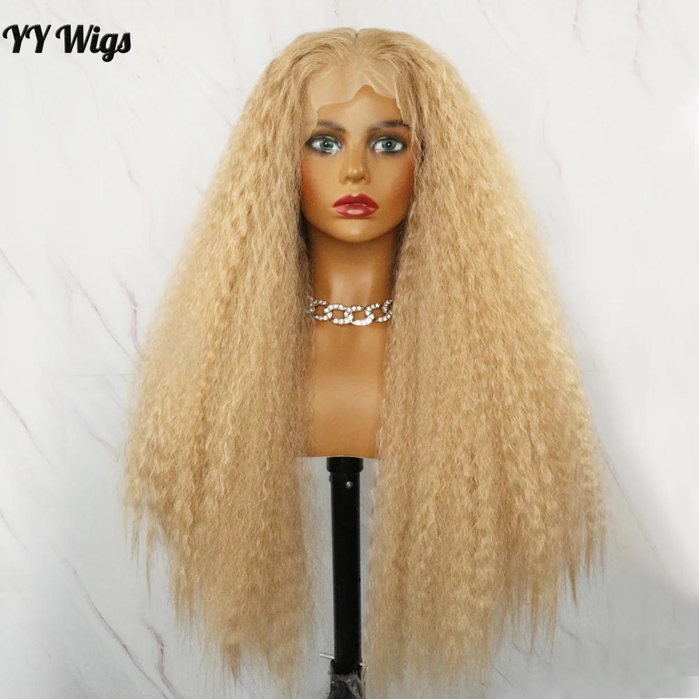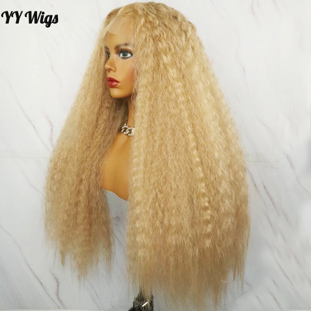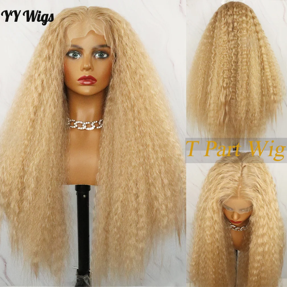 #103 Kinky Straight Heat Resistant Fiber Synthetic Lace Wigs for Black Women T-PART Synthetic Wig Blonde Long Yaki Style